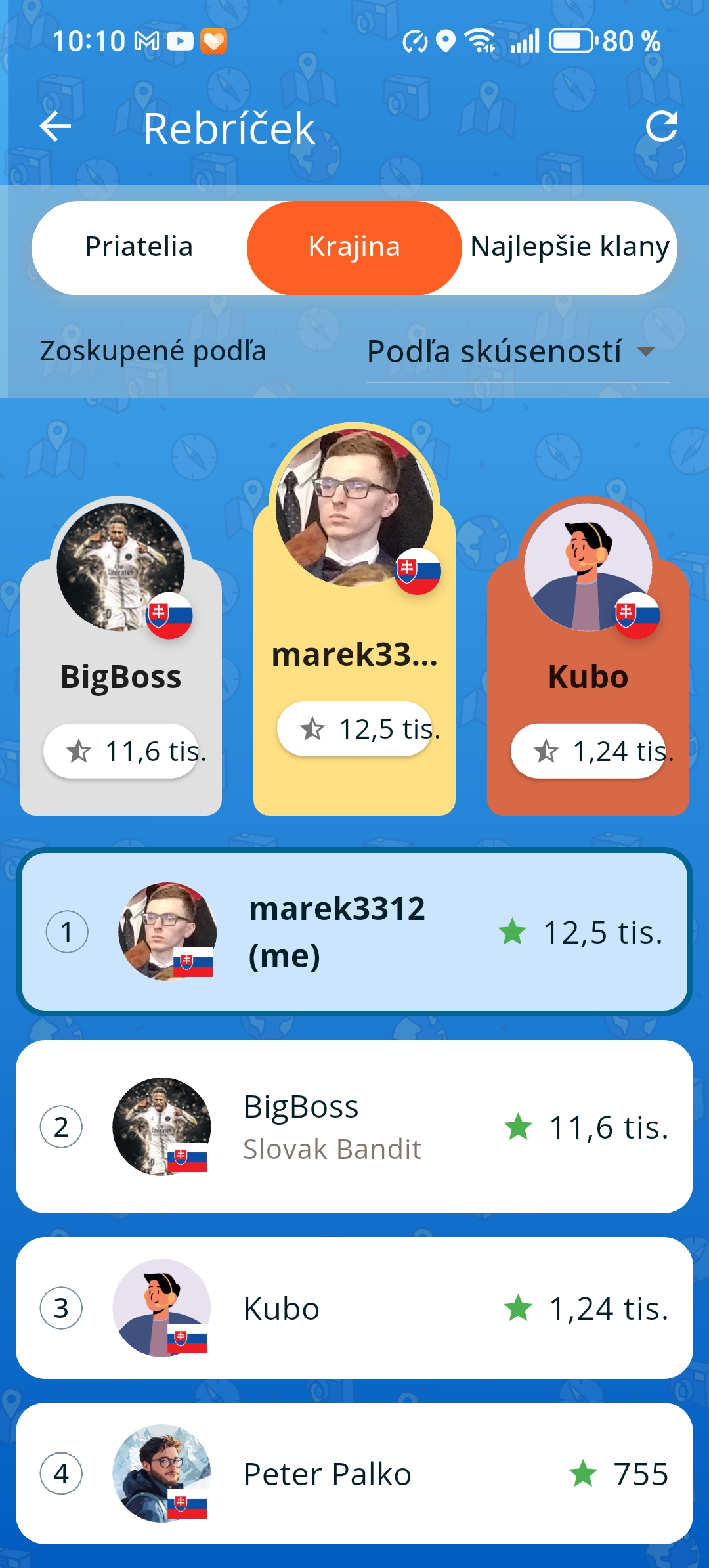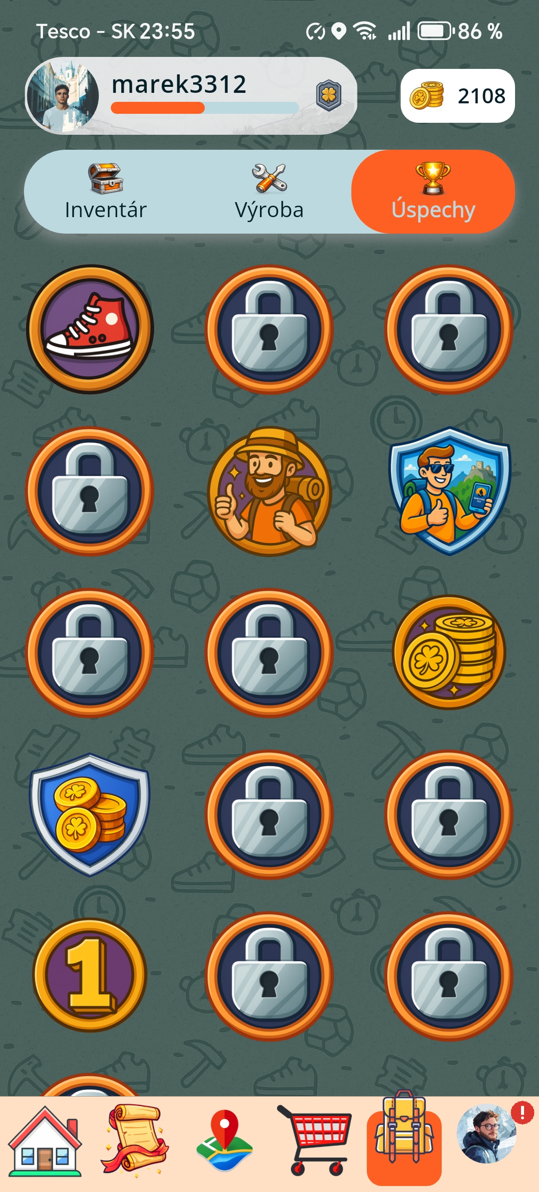 Odznaky za navštívené miesta, série, milestone výzvy a špeciálne odmeny.